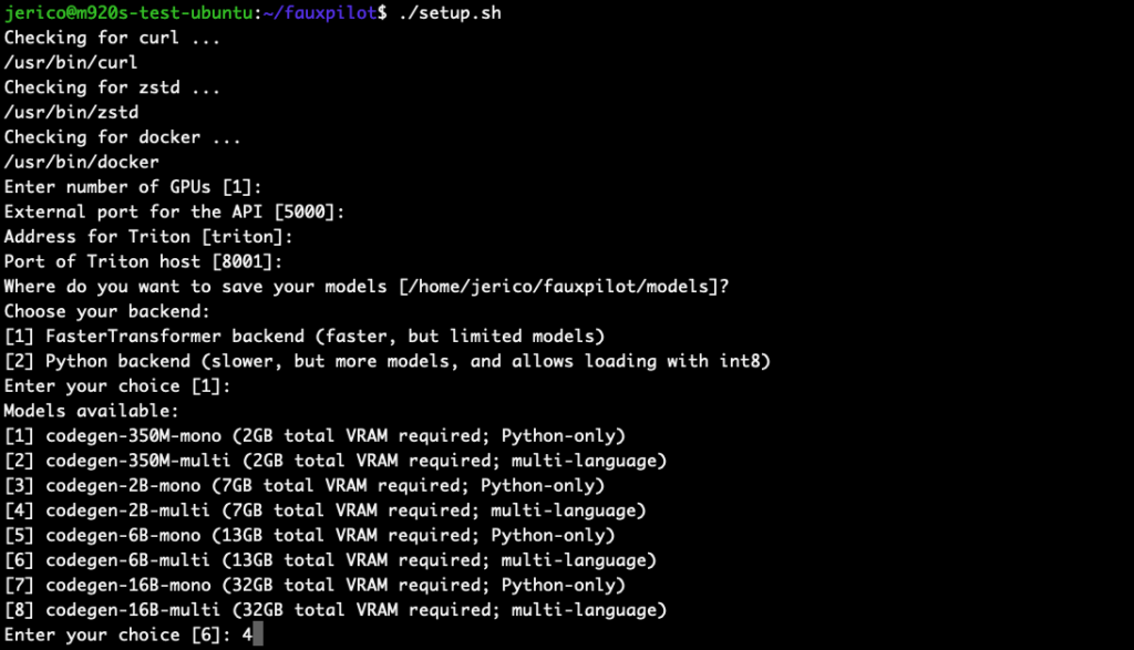 I use Ubuntu 20.04 as my base OS. From a fresh install, here’s what I needed to do to run FauxPilot.